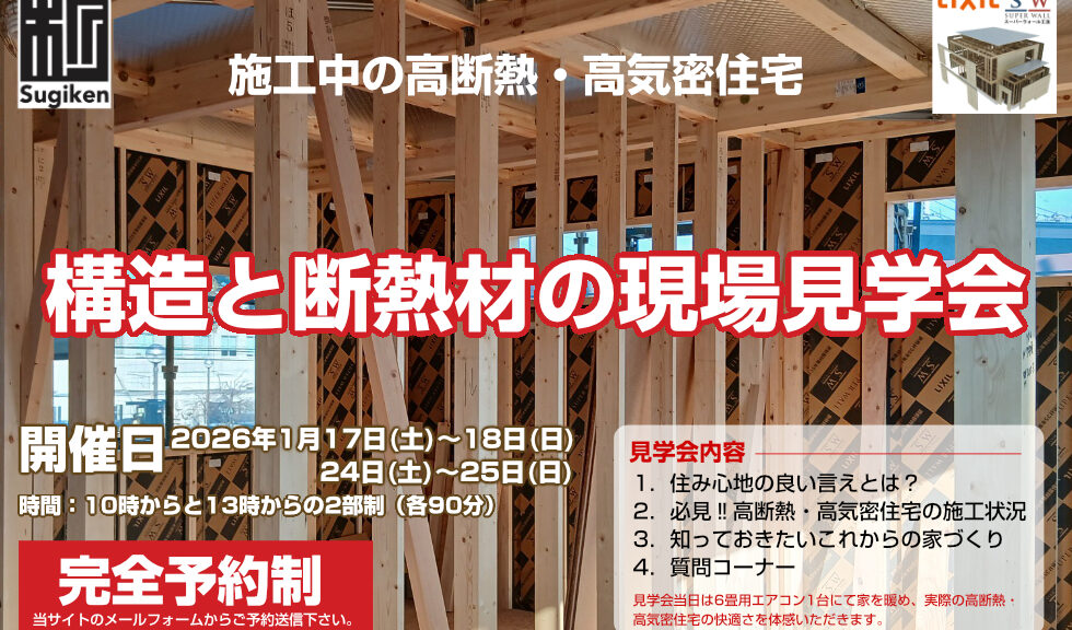 2026年1月17日(土)から週末に2週連続で【構造と断熱施工の現場見学会】を行います。当日は現場に6畳用エアコンを実際に動かし高断熱・高気密住宅の快適さを体験…